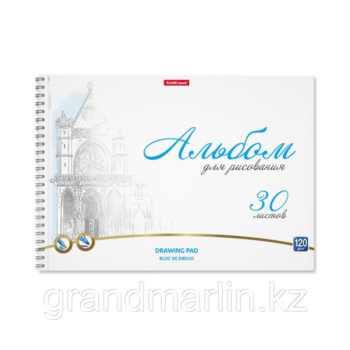 Альбом для рисования формата А4 (210х294 мм). Обложка из высококачественного мелованного картона плотностью 170 г/м2. Жесткая подложка 360 г/м2. В блоке 30 листов. Бумага плотностью 120 г/м2. Белизна бумаги - 100%. Микроперфорация для отрыва. Тип скрепления - спираль.