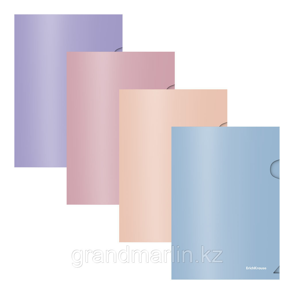 Папка-уголок формата A5+ из высококачественного непрозрачного пластика с текстурой поверхности "софт-тач", на которой не видно отпечатков пальцев и мелких царапин. Предназначена для хранения и транспортировки небольшого количества документов. Папка вмещает до 20 бумажных листов. Цвет папки - ассорти: бежевый, голубой, розовый, фиолетовый. Размер - 184х226мм, толщина - 0.18мм.