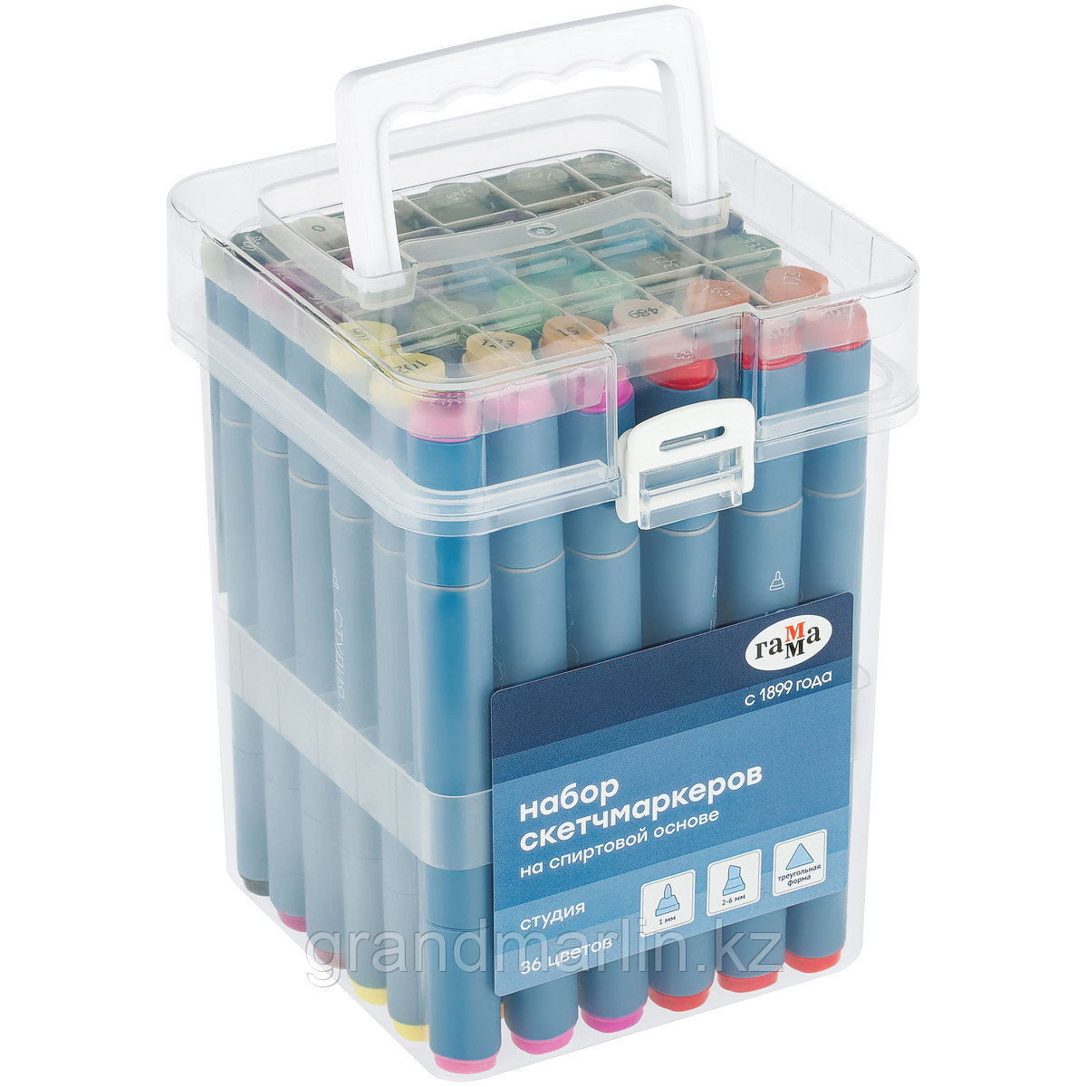 Набор двусторонних маркеров для скетчинга ГАММА серии «Студия» – выбор профессионалов, любителей и начинающих художников, дизайнеров и иллюстраторов. В наборе 36 основных цветов. Перманентные чернила на спиртовой основе не токсичны и быстро сохнут на поверхности, оставляя яркий след. Маркеры на спиртовой основе имеют два наконечника: пулевидный с шириной линии 1 мм и долото (клиновидный) 2-6 мм. Пулевидный наконечник подойдет для прорисовки деталей, работ в различных графических техниках, создания текстур и проработки контуров. Клиновидный наконечник идеален для работ на больших поверхностях и тех, кто занимается каллиграфическими техниками, так как он позволяет варьировать ширину линии. Маркеры для рисования мягко ложатся на поверхность, создавая ровный цвет без разводов. Цвета отлично смешиваются между собой, образуют плавные переходы и новые оттенки. Маркерами можно рисовать на бумаге, холсте и других поверхностях. Трехгранный матовый корпус диаметром 1, 55 мм из полипропилена нежно-голубого цвета легкий и